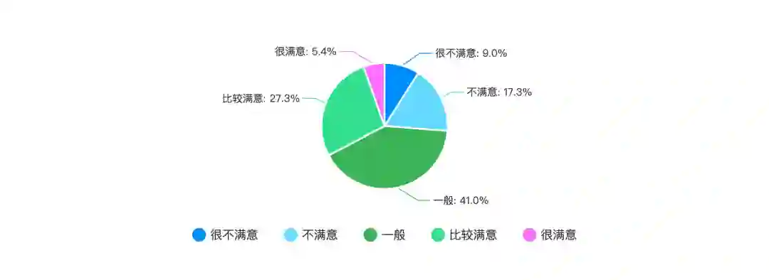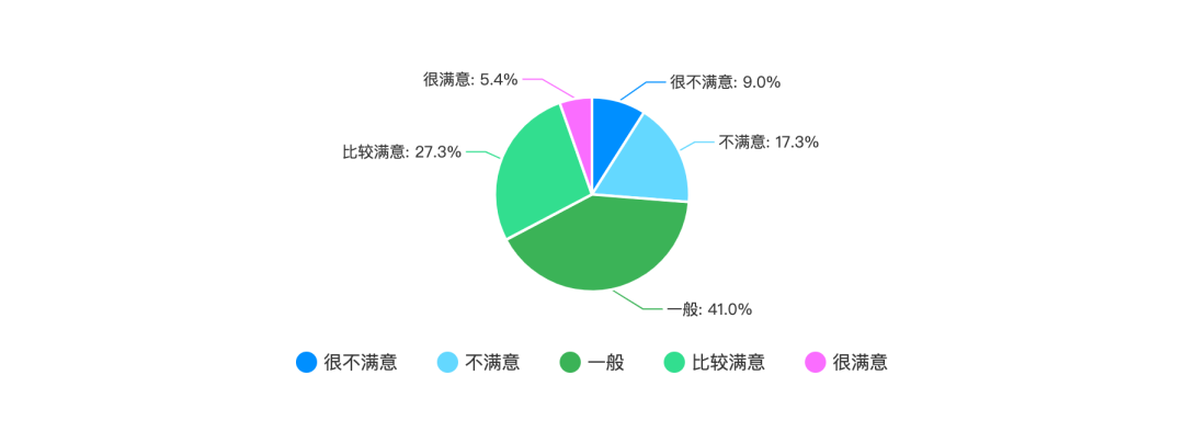 上图是程序员对工作环境的满意度,从调查中我们可以看到,大部分人认为自己的工作环境还可以。仅有 26.3% 的程序员对自己的工作环境不满意或者很不满意。有 41.0% 的程序员认为自己的工作环境一般,有 32.7% 的程序员对自己的工作环境比较满意或者很满意。这也从侧面反映了现在互联网公司越来越注重工作环境的建设,有一个好的工作环境,大家工作起来也就更开心,幸福感更高。此外,有 9.0% 的程序员对自己现在的工作环境很不满意。