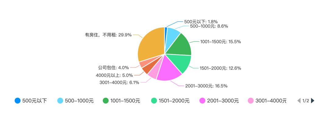 从上图我们可以看出,在租房的人中,房租主要为 1000-3000 元/月之间。有 6.1% 的人,房租为 3001-4000 元/月。有 5.0% 的人,房租为 4000+ 元/月,小编猜测这部分人应该已经组建了小家庭,或者特别追求生活品质,并且工资应该不低。除此之外呢,有 8.6% 的人房租为 500-1000 元,有 1.8% 的人房租低于 500 元/月,还有 4.0% 的人是公司包住。