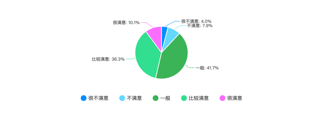 上图是程序员对公司同事的满意度,我们可以看到,有 46.3% 的程序员对自己的同事比较满意或者很满意。有 41.7% 的程序员认为同事一般,仅有 11.9% 的程序员对同事不满意甚至很不满意。