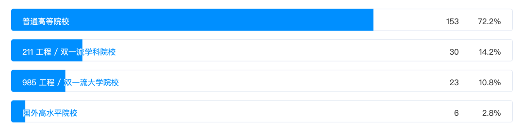 此外,程序员客栈在本次调查中,还对程序员的毕业院校类别进行了调查。从上图中我们可以看到,本科及以上学历的程序员中,72.2% 的小伙伴毕业于普通高等院校,14.2% 的小伙伴毕业于 211工程/双一流学科院校,10.8%的小伙伴毕业于 985 工程/双一流大学院校,另有 2.8% 的小伙伴毕业于国外高水平院校。这个分布情况也与我国各类别院校的数量占比相吻合。