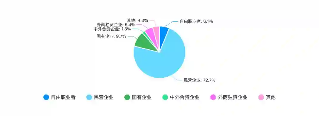 从数据中我们还可以看到,有 9.7% 的程序员工作在国企,有 7.2% 的程序员工作在中外合资或外商独资的 企业中,整体占比并不高。