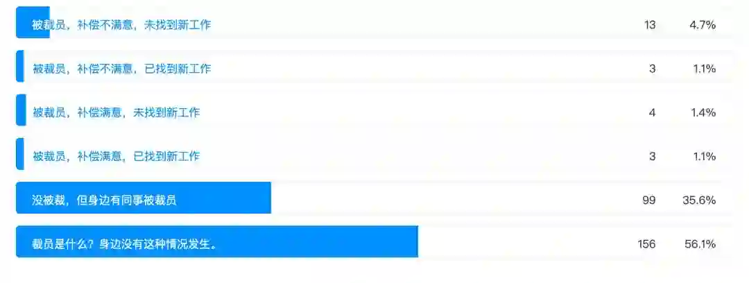 2019 年底开始,爆发了新型冠状病毒疫情,导致年后企业无法正常复工,很多互联网公司面临经营问题。针对这个情况,在本调查的最后也增加了对裁员的调查。
