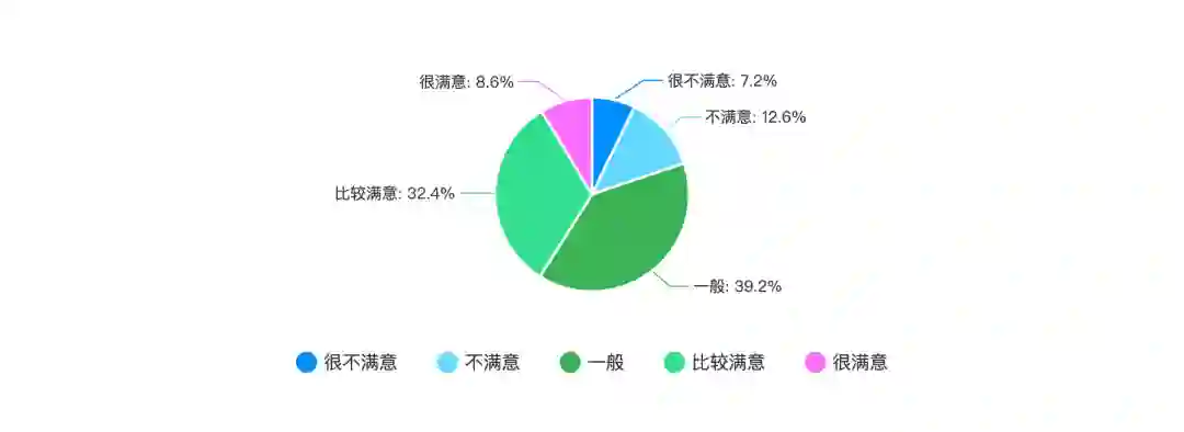 上图是程序员对公司领导的满意度,我们可以看到,有 41.0% 的程序员对自己的领导比较满意或者很满意。有 39.2% 的程序员认为领导一般,有 19.8% 的程序员对自己的领导不满意甚至很不满意。
