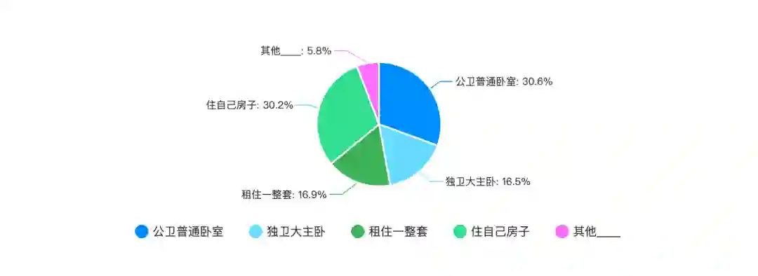 我们对程序员群体的居住情况进行了调查,有 30.2% 的程序员住在自己的房子里,不用租房,租房住的小伙伴占 64%,其他的占 5.8%。在租房住的程序员中,合租的占 73.6%,其余的 26.4% 是租住一套房。在合租的小伙伴中,65.0% 的小伙伴租的是公卫普通卧室,35.0% 的小伙伴租的是独卫大主卧。