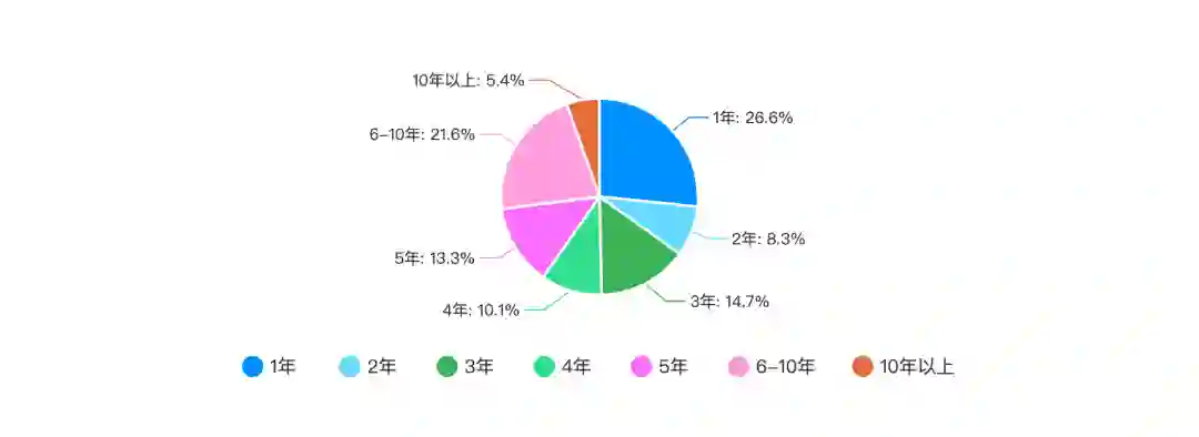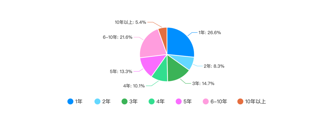 从上图中我们可以看到,工作年限为 5-10 年成程序员占了程序员群体的 40.3%,属于资深程序员。刚参加工作的程序员占总体的 26.6%,工作 2-4 年的程序员占总体的 33.1%,而工作十年以上的程序员占总体的 5.4%。