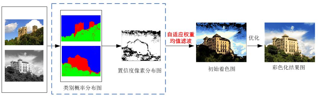 同时根据初步迁移结果对低置信度像素点进行颜色扩散,最终完成灰度图像彩色化。