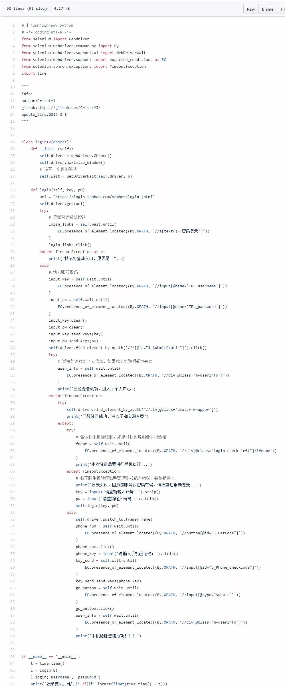 每一个网站都会有对应的登录代码,有的还有数据的爬取代码。下面我们以淘宝为例: