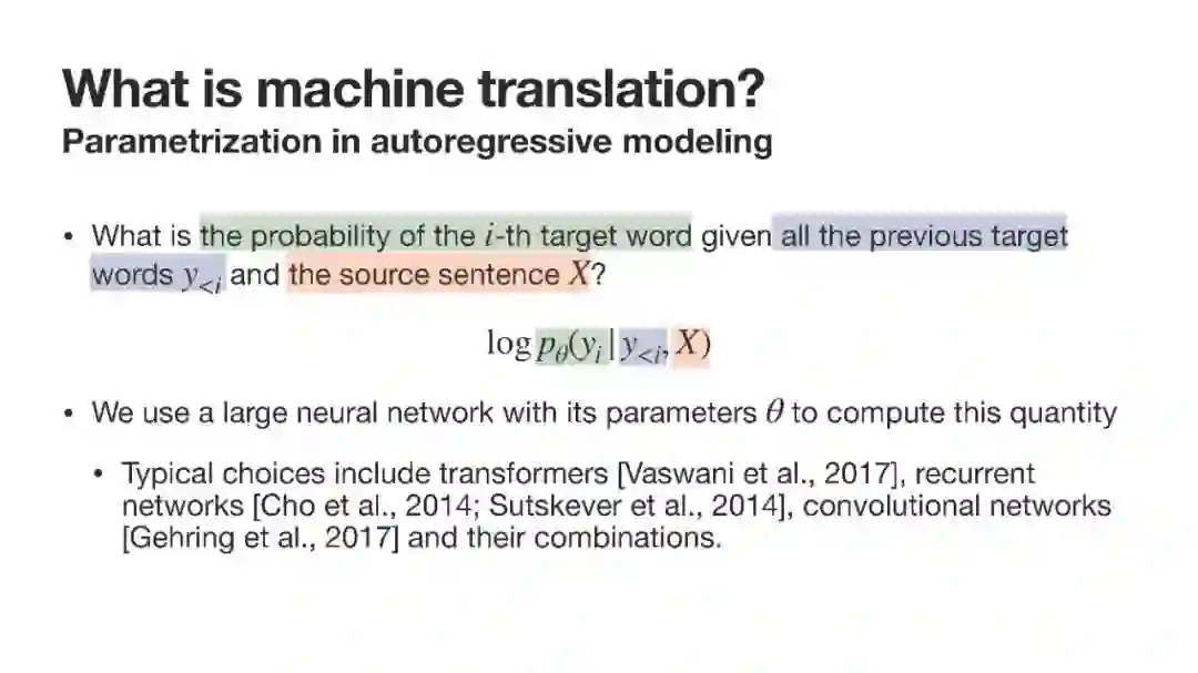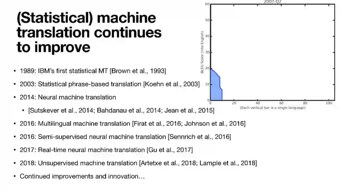 机器翻译能够实现多种语言之间的自动翻译,方便人类的沟通和交流,具有重要的研究价值。神经机器翻译(NMT)是一种端到端的自动翻译系统。统计机器翻译方法(SMT)曾经是研究最多,最为成功的机器翻译系统。2014年基于神经网络的NMT推出以后,由于其存在许多缺陷,发展已经进入低谷。传统的NMT存在缺乏稳定性,计算耗时等问题。2016年,谷歌公司推出了神经机器翻译系统GNMT。来自纽约大学Kyunghyun Cho副教授讲解了《机器翻译》最新进展,50页ppt