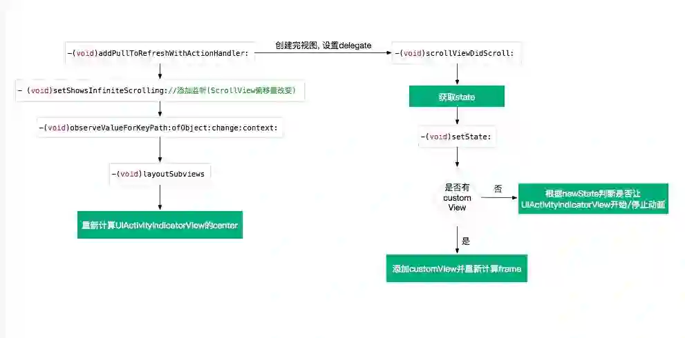 self.viewForState为一个可变数组, 里面是而且根据状态装入相应state的customView, 首先从通过- (void)setCustomView:forState:方法添加后removeFromSuperview从父视图剥离, 之后根据是否传入了customView决定是否添加自定义视图; 如果没有customView则改变里面arrowView的角度;最后都得改变titleLabel, subtitleLabel, arrow, activityIndicatorView的尺寸或位置;值得注意的是里面的一个方法暴露了demo的年纪, O(∩_∩)O哈哈~