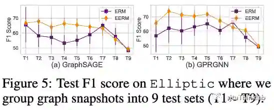 动态图时序外推 另一种典型的分布偏移来源于时序动态图,训练数据往往是历史某个阶段收集的片段,测试数据则来源于未来。随着时间的推移,图数据可能发生变化。这里我们进一步考虑两种不同的情况。第一种情况对应动态的时序snapshot,我们考虑Elliptic数据集,它一共包含49个graph snapshot,每一个记录了在一段时间内的金融交易,任务是识别网络中的非法节点。我们把snapshot按时间顺序排列,使用前5个作为训练,第6-10个作验证,其余的作为测试集(把每相邻的4个合并为一组)。我们使用F1分数作为评测指标,下图显示了使用GraphSAGE和GPRGNN作为主干模型的效果对比。可以看到,EERM显著好于ERM,取得了平均9.6%/10.0%的提升。