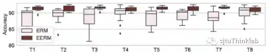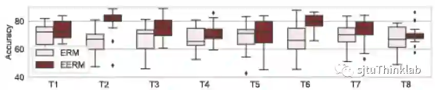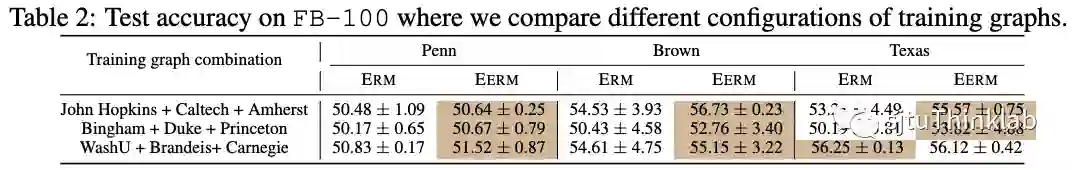 对于Facebook数据集,我们考虑使用多个图进行训练。具体的,我们考虑三种训练子图的组合。下表显示了使用不同训练子图的组合,在三个测试图(Penn,Brown,Texas)上的准确率对比。同样,EERM在绝大部分情况下超越了ERM,取得了最高7.2%的提升。
