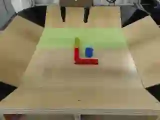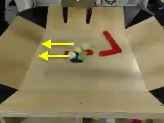 在下面的例子中,作者们设定只允许机器人在绿色阴影范围内移动,目标是把蓝色圆柱体向自己的方向移动。显然,这个任务的关键就是机器人想到了如何使用 L 型的木块把圆柱体钩过来。
