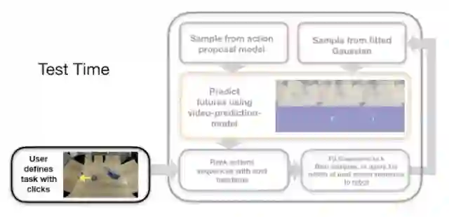 在测试时,机器人可以使用模仿学习训练的模型来指导规划过程,然后用预测模型来觉得哪些动作可以让它完成目前的任务。
