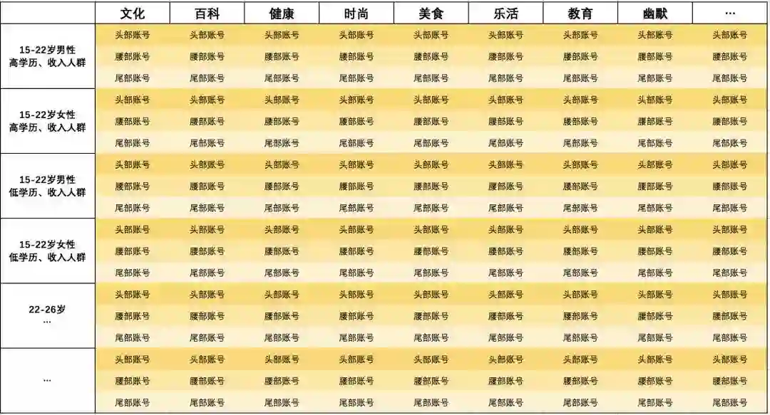 当然,真实情况下,生态位并不像图中这样均匀分布,比如幽默、情感这些类目,K12 家长等人群,明显更多,因此他们交织出来的生态位更大,此生态位的商业价值也就更大。