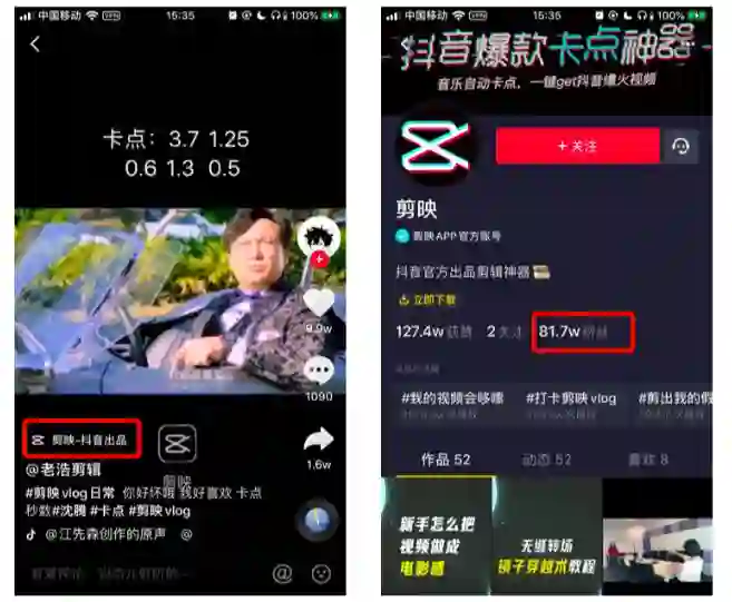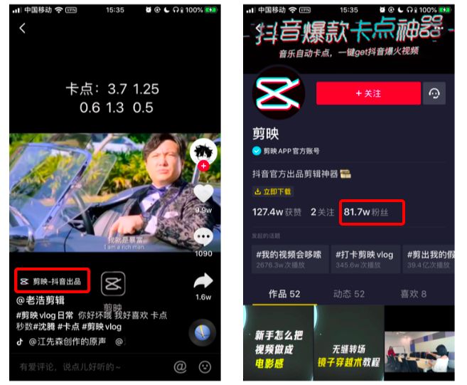 剪映是抖音官方推出的视频剪辑神器。在抖音里,我们能看到大量带有剪映出品的视频,点赞量大多在 1w 以上,官方账号粉丝也达到 80w+。