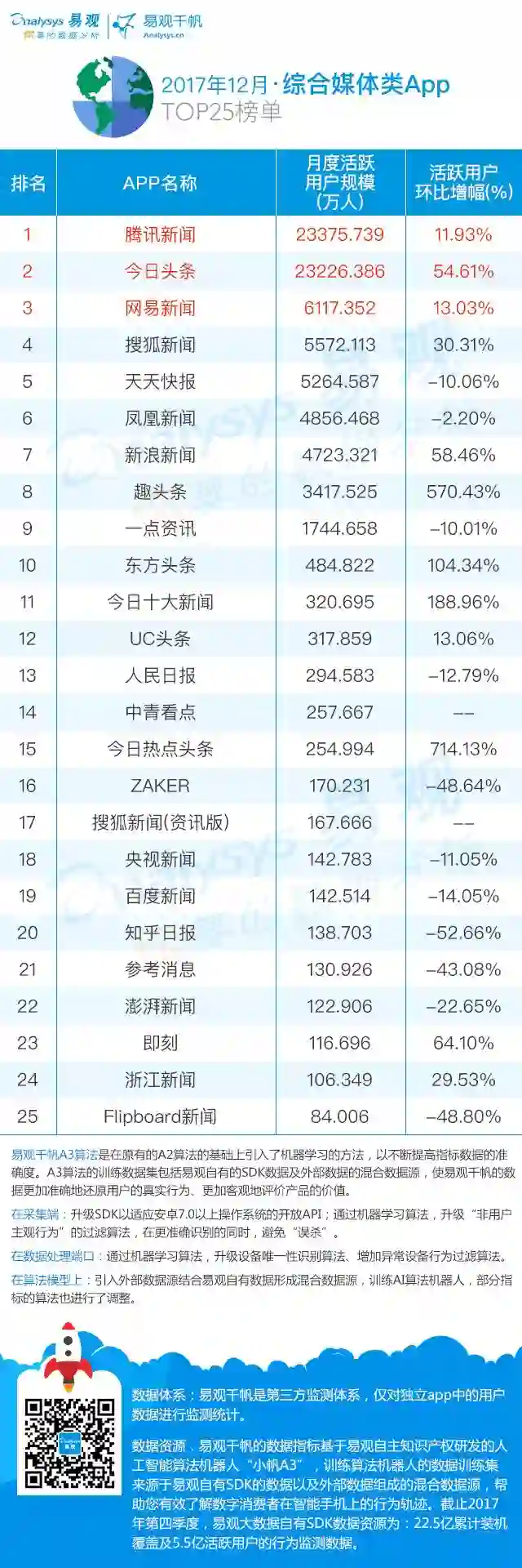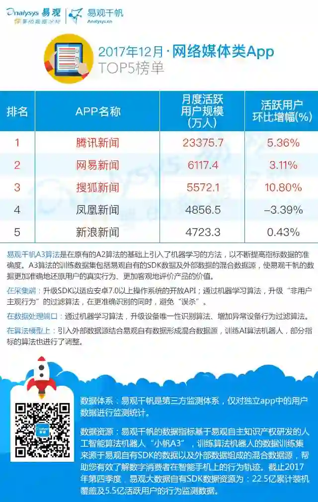 腾讯新闻作为网络媒体领域领头羊,凭借微信、QQ等全网级社交分发平台和较为齐全的产品布局,目前占据资讯领域第一位置,根据易观千帆·A3数据,2017年12月,腾讯新闻月活跃用户2.34亿,相较去年同期,同比增长10.95%,继续保持稳步增长。2017年年底,腾讯宣布将全面开放内容平台,升级企鹅号,推出百亿计划、MCN计划,加大对内容创作者的扶持力度,希望凭借开放的海量内容吸引用户注意力。
