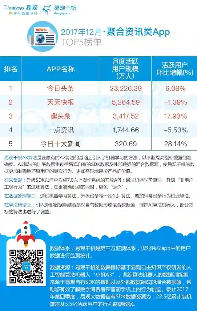 聚合资讯诞生于移动互联网时代,自2012年今日头条上线,代表着个性化算法分发时代来临。2017年聚合资讯领域在激烈的竞争中,市场格局发生了深刻变化,今日头条继续占据垄断地位,天天快报、一点资讯与今日头条差距拉大,趣头条凭借“红包战法”高歌猛进,进入市场前五。