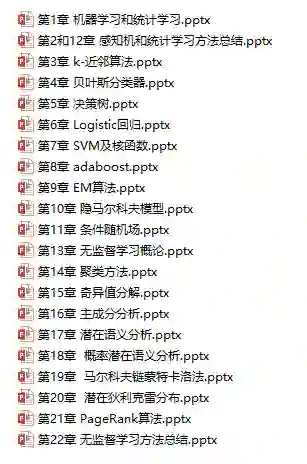 所有的课件都是 ppt 格式,总共包含 22 章。正好是《统计学习方法》第 2 版的完整内容。