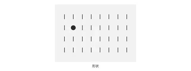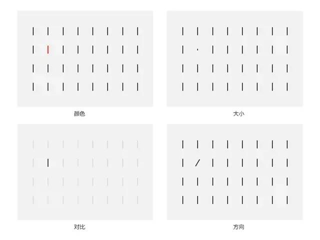 通过去预设目标对象和干扰对象的颜色、大小、对比和方向的不同特征属性。观察者也可以快速的通过这种“特征搜索” 迁移注意点。