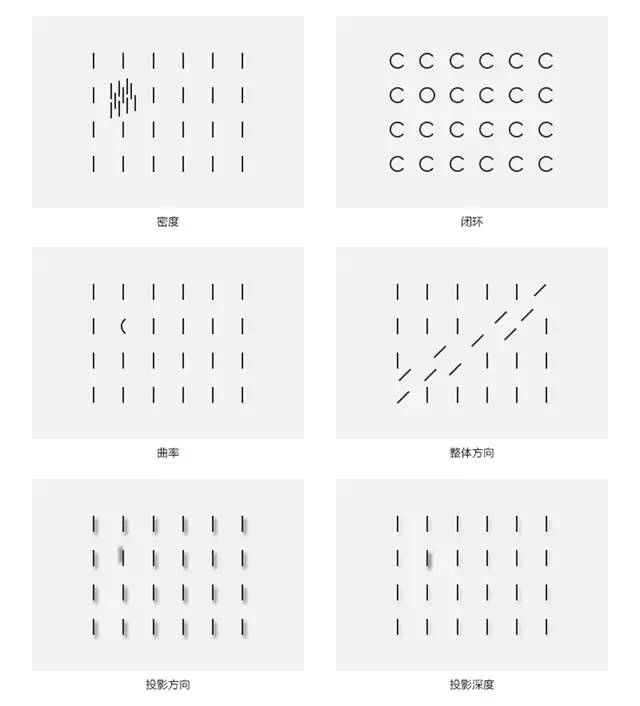 除了上述列举的【形状】、【颜色】、【大小】、【对比】、【方向】。还列举出一下视觉元素的对比【密度】、【闭环】、【曲率】、【整体方向】、【投影方向】和【投影深度】。