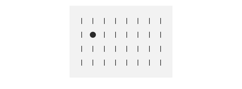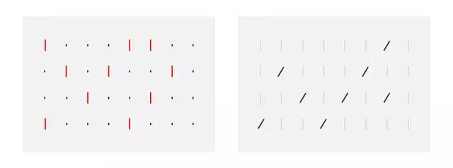 之所以很快就能找到这些注意点,因为它们跟其干扰项相比,最多只相差了一种视觉元素。比如,红色线条和黑色线条,长线条和短线条。当只有一种视觉元素的时候,我们的视觉系统中的低层视觉系统(Preattentive Processing) 就起作用了,它可以平行处理所有在图中出现的点,然后很快找到特征点。我们再来看下反例