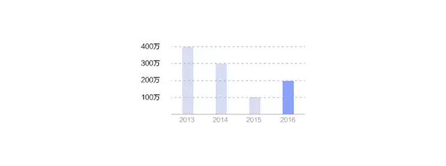 但是我们把所有数据拉出来看,却发现出完全不同的事实,2013年销售额400万,2014年300万,2015年100万。2016年虽然比2015年增长了,但是和前几年相比有着明显的下滑,这就是一种图表展示的错误诱导的方式。