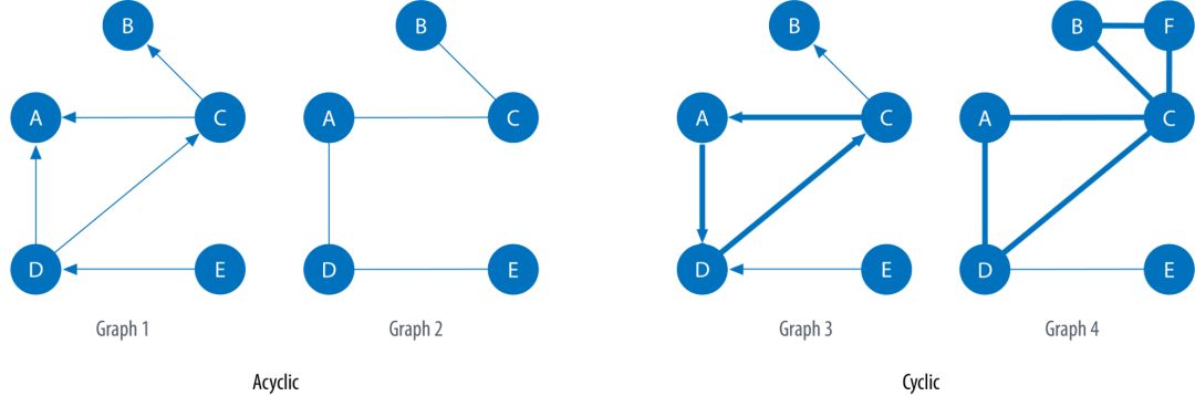 图论中,循环指一些特殊的路径,它们的起点和终点是同一个节点。在非循环图(Acyclic Graph)中,不存在循环路径,相反则为循环图(Cyclic Graphs)。如下图所示,有向图和无向图都可能包含循环,所不同的是,有向图的路径必须遵循边的方向。图中的 Graph 1 是一个典型的 DAG(Directed Acyclic Graph,有向无循环图),并且 DAG 通常有叶子节点(leaf node,也称 dead node)。
