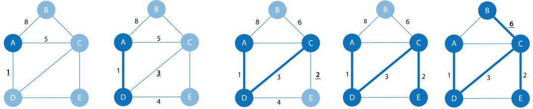上图是最小生成树算法的步骤分解,算法最终用最小的权重将图进行了遍历,并且在遍历的过程中,不产生环。