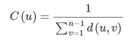 其中 u 是我们要计算紧密性中心性的节点,n 是网络中总的节点数,d(u,v) 代表节点 u 与节点 v 的最短路径距离。更常用的公式是归一化之后的中心性,即计算节点到其他节点的平均距离的倒数,你知道如何修改上面的公式吗?对了,将分子的 1 变成 n-1 即可。