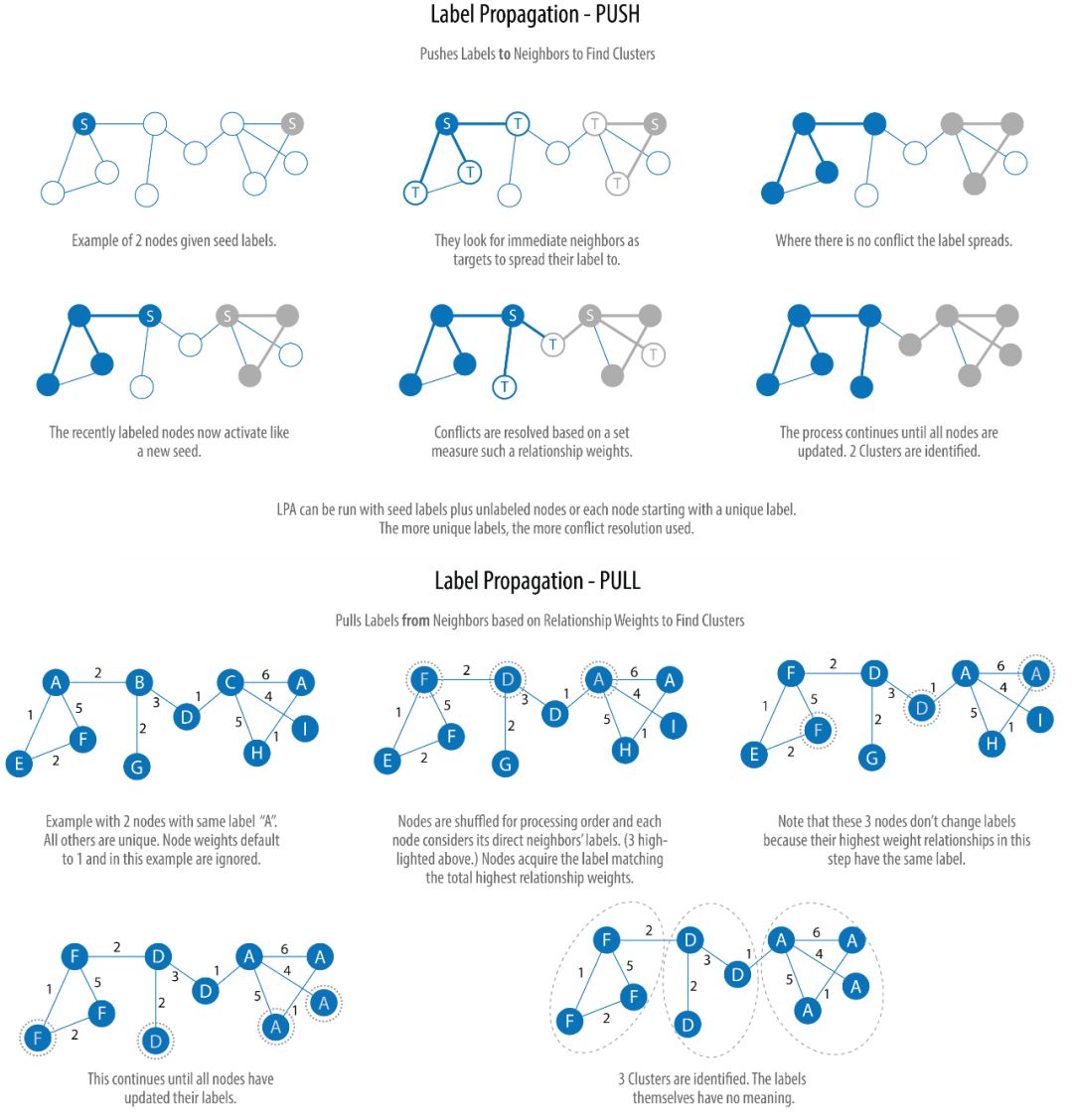 LPA 是一个较新的算法,由 Raghavan 等人于 2007 年提出。我们可以很形象地理解算法的传播过程,当标签在紧密联系的区域,传播非常快,但到了稀疏连接的区域,传播速度就会下降。当出现一个节点属于多个社群时,算法会使用该节点邻居的标签与权重,决定最终的标签。传播结束后,拥有同样标签的节点被视为在同一群组中。