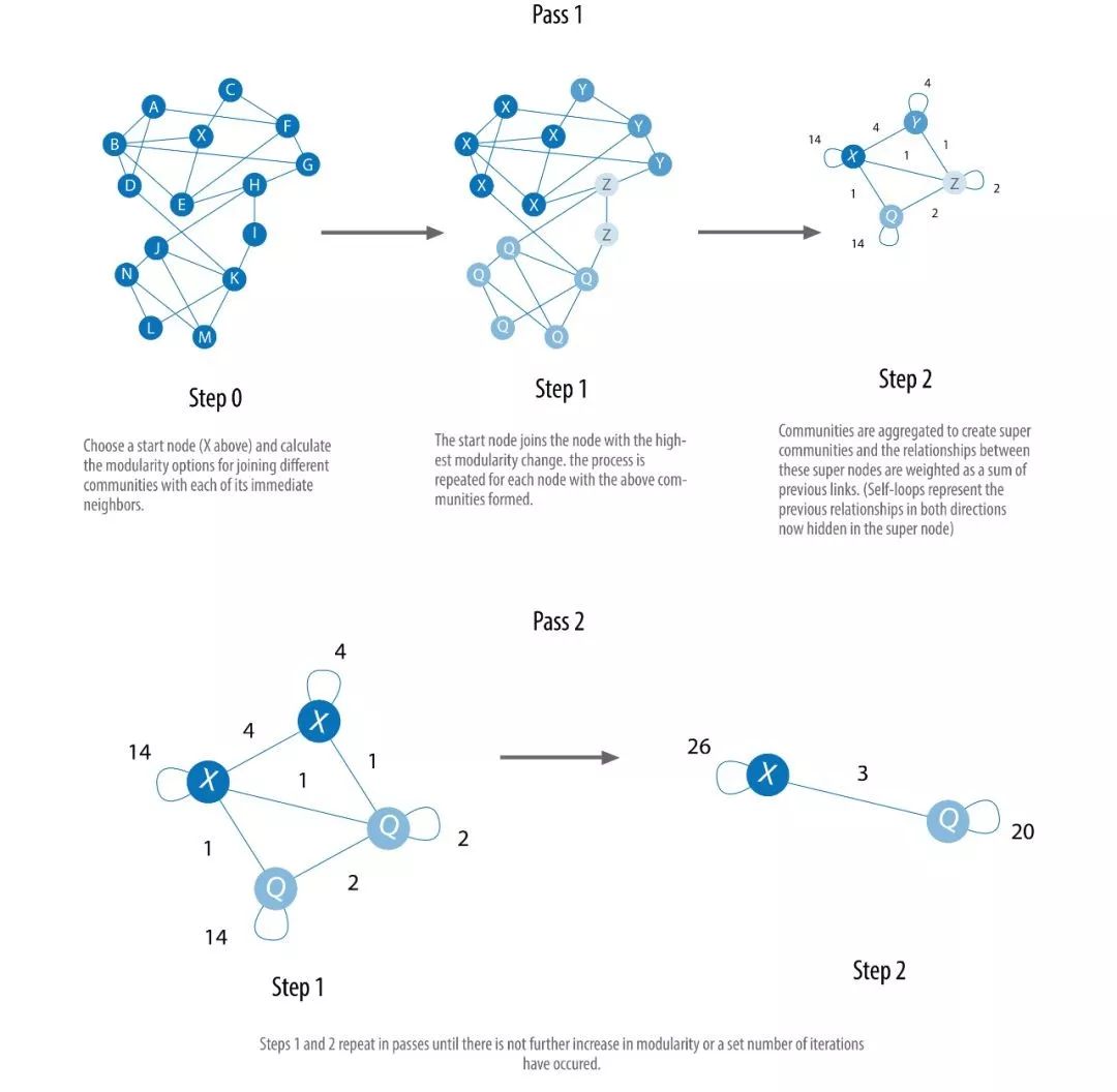 算法在 2008 年被提出以后,迅速成为了最快的模块化算法之一。算法的细节很多,我们无法一一覆盖,下图给出了一个粗略的步骤,帮助我们理解算法如何能够多尺度地构建社群: