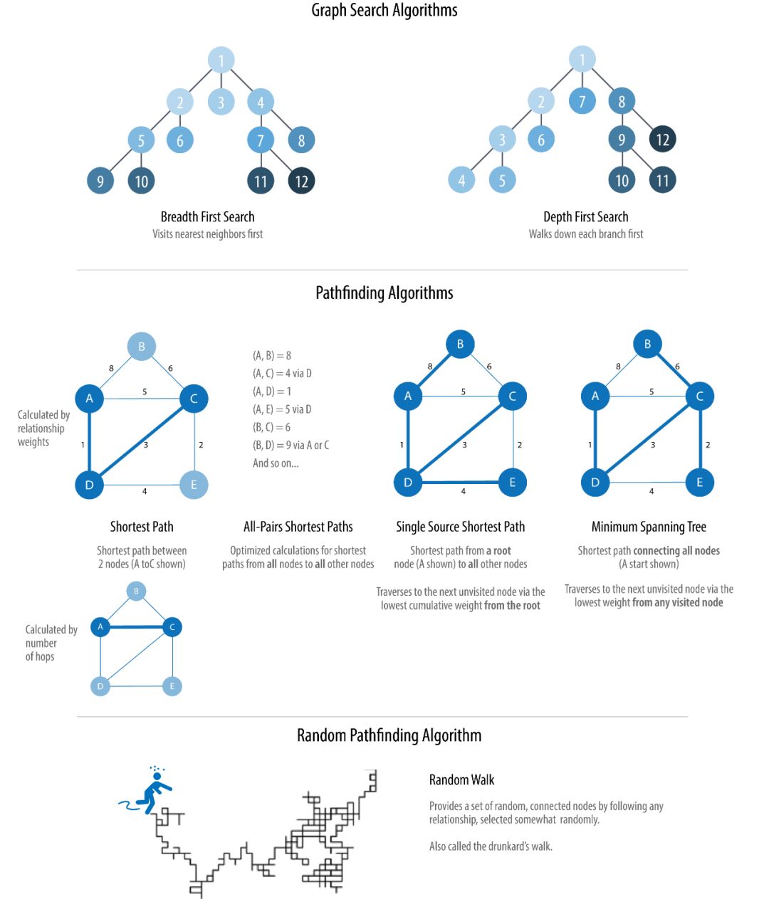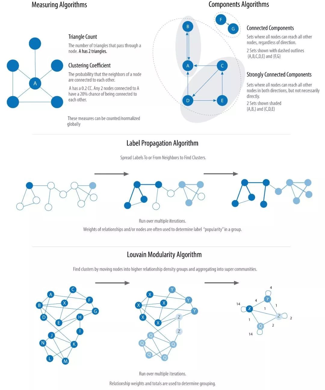 我们关注三类核心的图算法:路径搜索(Pathfinding and Search)、中心性计算(Centrality Computation)和社群发现(Community Detection)。