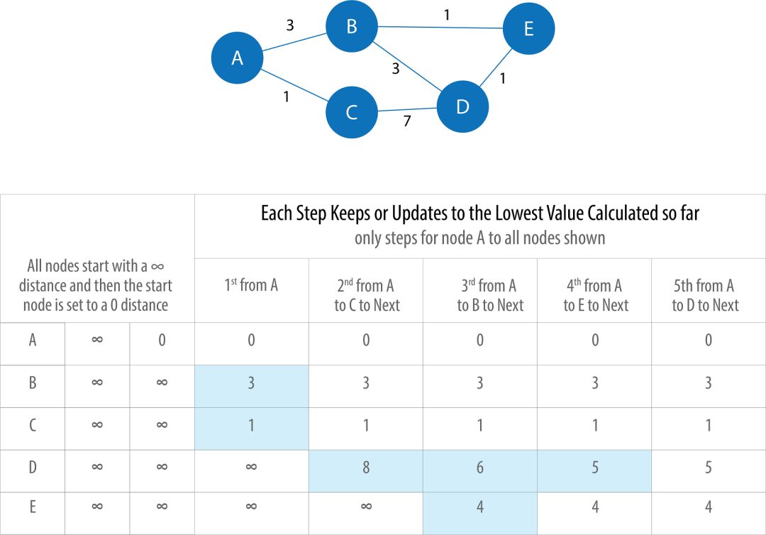 最常见的最短路径算法来自于 1956 年的 Edsger Dijkstra。Dijkstra 的算法首先选择与起点相连的最小权重的节点,也就是 “最临近的” 节点,然后比较 起点到第二临近的节点的权重 与 最临近节点的下一个最临近节点的累计权重和 从而决定下一步该如何行走。可以想象,算法记录的累计权重和 如同地理的 “等高线” 一样,在图上以 “波” 的形式传播,直到到达目的地节点。