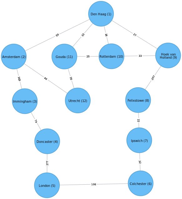 如果没有权重,计算最短路径时,实则在计算关系(Relation,也称 Hop)的数量。那么在上图左边,我们找到 A 和 E 之间的最短距离为 2,经过 D 点。如果像上图右边所示,边被赋予了权重,用以代表节点之间的物理距离(单位:KM)。那么我们可以找到 A 和 E 之间的最短距离是 50 KM,需要经过 C 和 D 两个点。而此时,在未加权图中计算的最短路径 A-D-E 距离为 70 KM,比我们找到的路径 A-C-D-E 距离远。