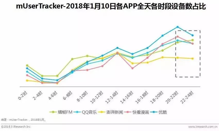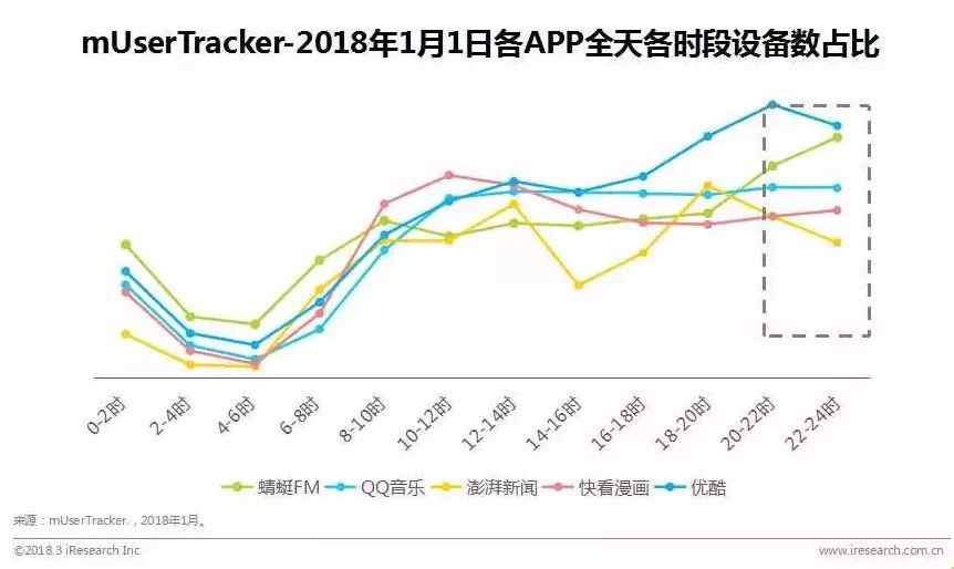 无论周末、节假日,还是工作日,大部分APP的用户活跃时段均在18-22时之间。仅音频类APP(以蜻蜓FM为例)在22时后用户活跃数依旧增加,与大部分网民上床睡觉时间较为吻合。