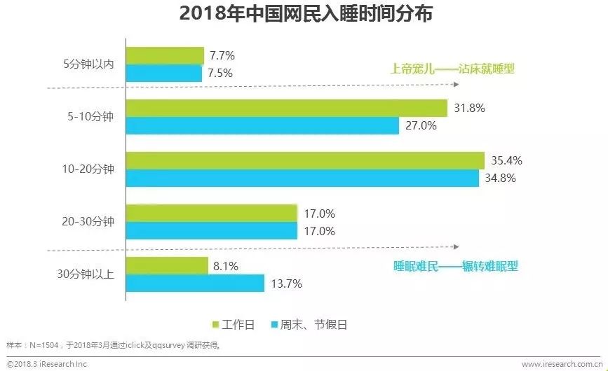 需要耗费30分钟以上才能入睡的睡眠难民,工作日占比8.1%,周末、节假日占比高达13.7%,休息时间更容易“high” 到睡不着!