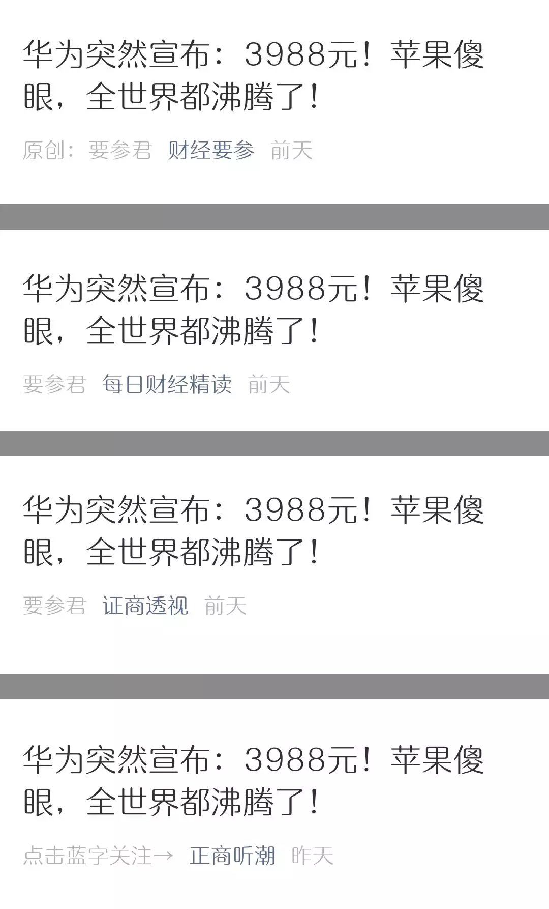 其中更是有一篇《华为突然宣布:3988元!苹果傻眼,全世界都沸腾了!》的文章在笔者的微信朋友圈被大肆转发,这篇文章夸张的写道: