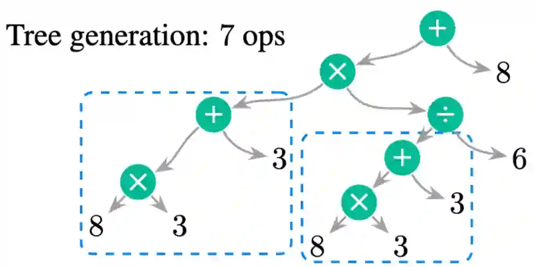同时 Seq2Tree 也有可以改进的地方,如下图所示,生成的过程是一个前序遍历 (pre-order traveral) 的过程,会先生成顶端的数学运算符 (operator),然后是 operator 左边的运算,最后是右边的运算。生成的过程相对来说比较不符合直觉,并不是一个一步步计算的过程。此外,我们可以看到同一个表达式 8×3+3 被生成了 2 次,然而我们其实是可以重复使用这个表达式的结果。但在 Seq2Tree 的方法中,我们无法这样去使用,必须重新生成整个子树结构。