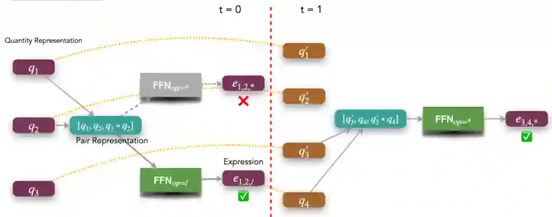 第一步我们得到 和 的联合表示,主要通过拼接 representation 方式完成,然后对于每一个 operator ,我们有一个 operator-specific 的 Feed-forward network 来得到数学表达式 的向量表达,从而这个新的表达式在下一个 timestep,会变成新的候选数字 。同时,在 inference 的过程当中,我们可能会得到错误的表达式,比如说上图的 。所以,我们是在所有可能的表达式中,通过 scoring 选取一个最好的表达式来当作 。然后当 的时候,我们最后能得到 。