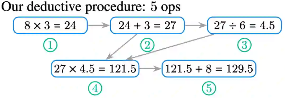 上面的这个(取自于 MathQA [3] dataset)例子中,我们需要得到最后被除数 (dividend) 129.5。同时数据集也给出计算的表达式,可以用来当作监督信号。这种多步的表达式,也便于验证 multi-step reasoning 的方法。这边我们也主要考虑一些基本的数学运算符,包括加 (+) 减 (-) 乘 (×) 除 (÷) 以及幂 (^),其他更复杂的运算其实可以分解成这些基本的运算。