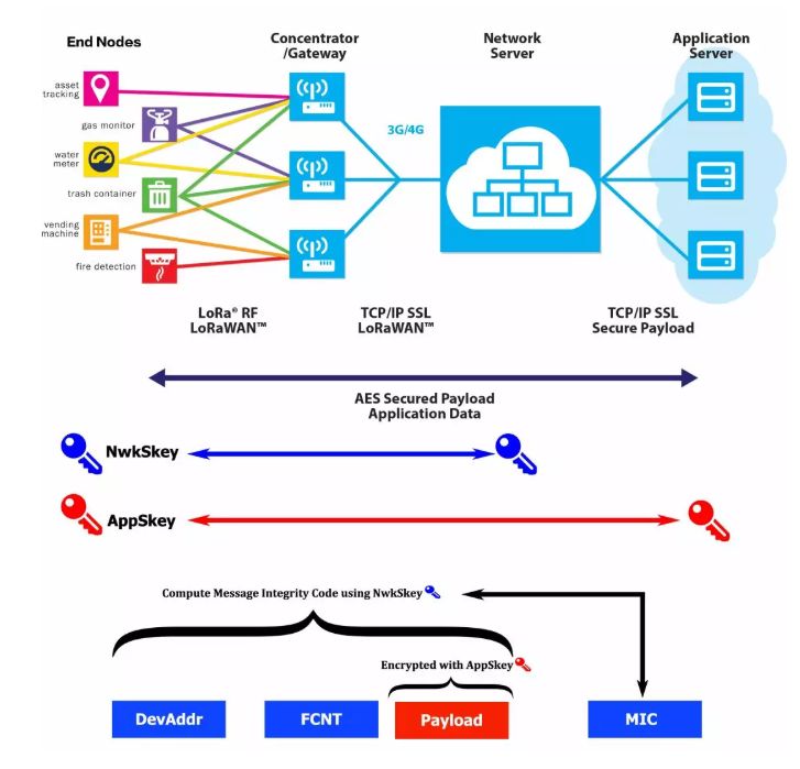 如上图,LoRaWAN具有两个安全层:网络层安全和应用层安全,分别使用NwkSKey和APPSKey两个会话秘钥对所有网络数据流量进行加密保护。