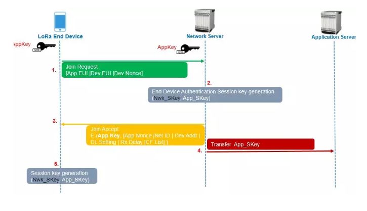 在理解该流程之前,再来了解一下一个根密钥AppKey,每一个LoRa终端具有一个唯一标识的128位AppKey, AppSKey 和NwkSKey由AppKey生成。