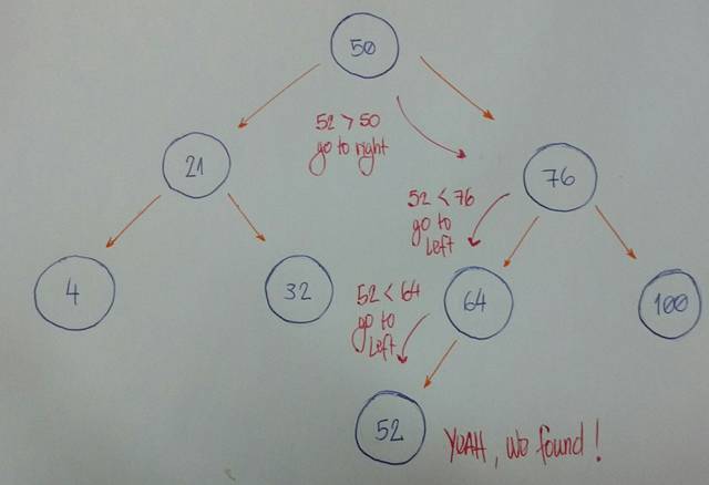 我们以根节点作为当前节点开始。给定值小于当前节点值吗?如果是,那么我将在左子树上查找它。