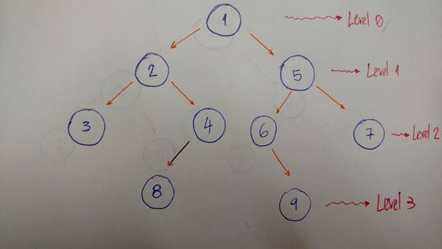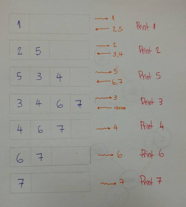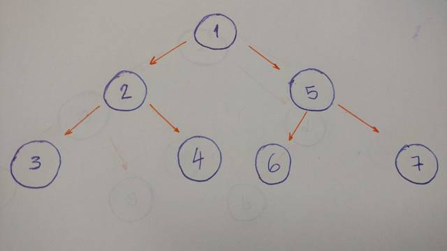 我们来一层一层的遍历这棵树。本例中,就是1-2-5-3-4-6-7.