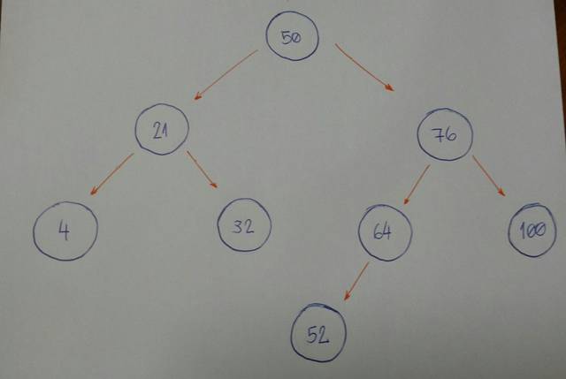 52比50大。但是50已经有了一个值为76的右孩子。52又比76小,但是76也有一个值为64左孩子。52又比64小,所以将52插入在64的左边。