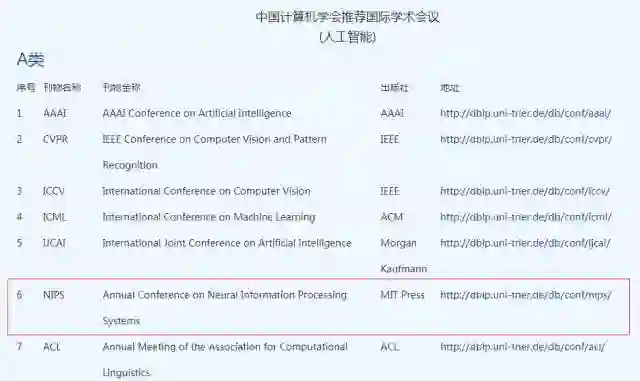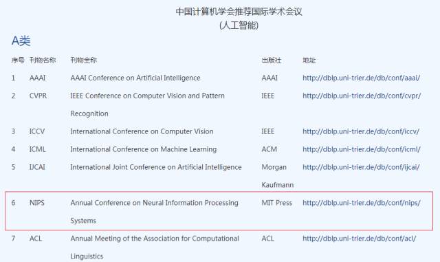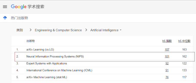 计算机学科由于成果更新迅速,更愿意通过会议优先发表成果,因此该类顶级会议大多比期刊更具权威性与影响力。NIPS 和 ICML 是机器学习领域最受认可的两大顶会,是中国计算机学会 CCF 推荐的 A 类会议及 Google 学术指标前五名。(见如下)