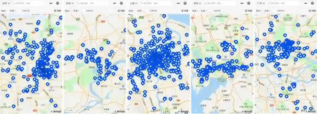 从左到右依次为ClassPass在北京、杭州、上海、深圳、广州的场馆分布图