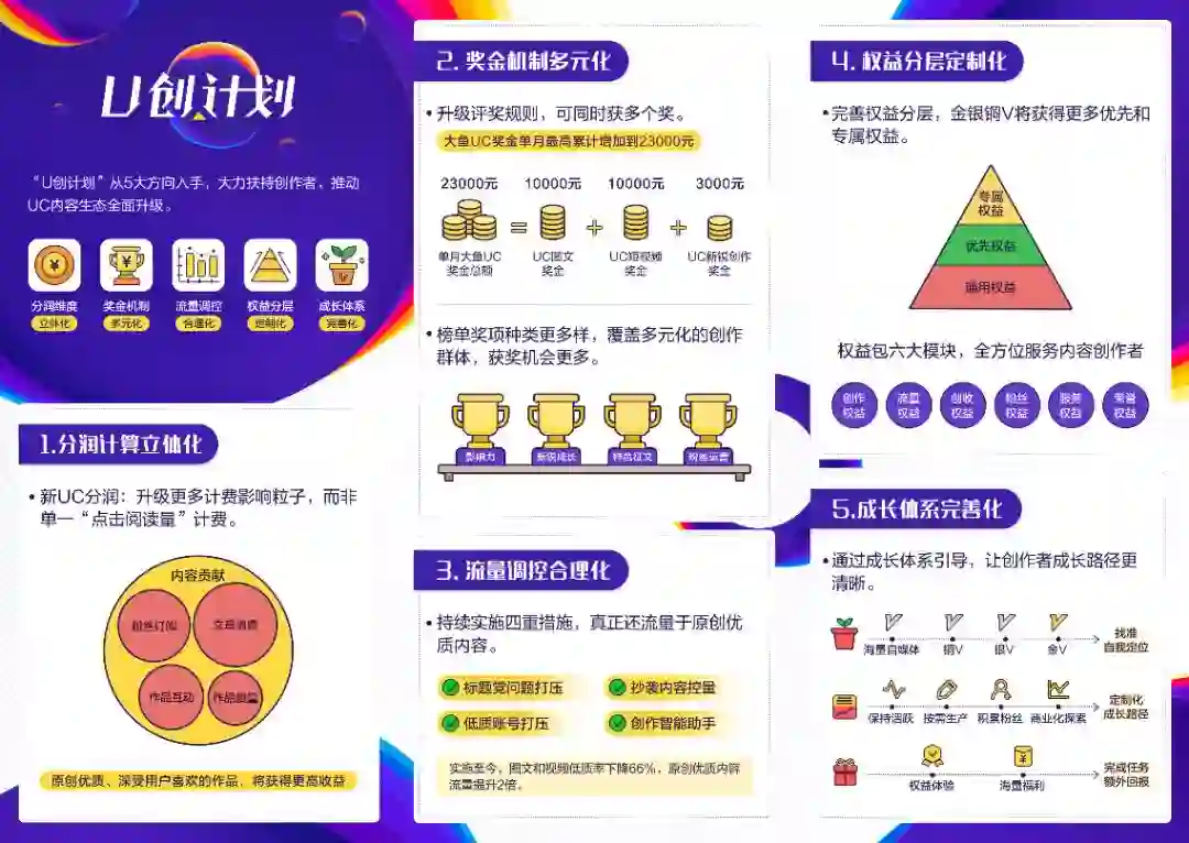 其次,“权益分层激励体系”将采用新UC分润(即引入更多计费影响元素——粉丝订阅、作品互动、作品质量等)及权益分层体系(即以金V银V铜V等方式,强化分层权益)等方式,给予不同类型的原创者更综合的权益收入。