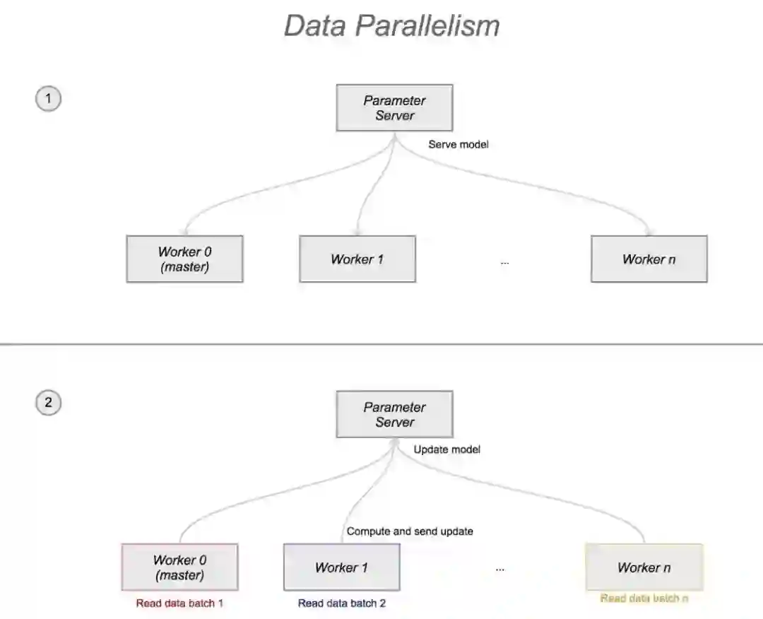 整个计算图被保存在一个或多个参数服务器(ps)中。训练操作在多个机器上被执行,这些机器被称作worker。这些worker读取不同的数据(data batches),计算梯度,并将更新操作发送给参数服务器。
