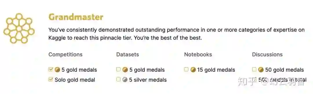 比较熟悉 Kaggle 晋升规则的小伙伴可能会了解,想要晋升 Kaggle GM,一共需要5枚金牌,并且最少要有1枚 Solo 金牌。于是乎一时间 Solo 金成为晋升 GM 的最大拦路虎,多少风云好汉都倒在了这一道门槛上,哪怕身怀6~8枚团队金牌,也只能望 GM 生叹,无法获得这尊贵的金色标志。
